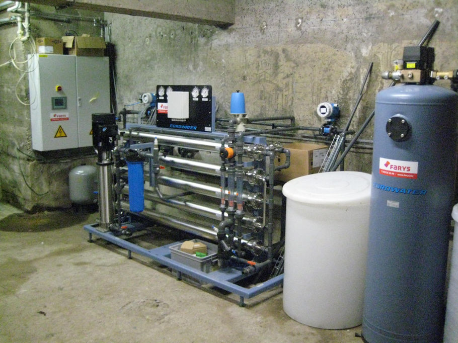 Het ruwe putwater wordt door een redundante pompgroep op voordruk gebracht om een viertraps-RO installatie te voeden. Deze installatie zal 3,5m³/u demin water (<30µS/cm) produceren aan een rendement van 80%.